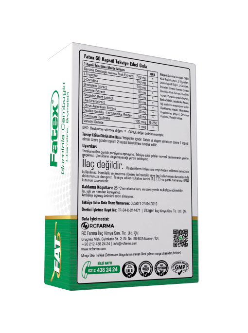 Fatex 60 kapsül, Garcinia Cambogia, Bromelain, Guarana, Dandelion Root, Uva Ursi, Citrus Aurantium Ekstreleri , L-Triptofan, Acetyl L-Carnitine, Krom Pikolinat, Vanadil Sülfat, Bacillus Subtilis ve Lactobacillus Reuteri probiyotikleri içeriği ile yetişkinlerin kullanımına yönelik özel bir gıda takviyesidir. Ürün üretiminde kullanılan kapsüller Lonza-ABD’den ithal edilip Helal Belgelidir. Titanyum dioksit içermez.